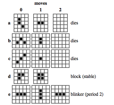 En 1970, el matemático británico John Horton Conway dió a conocer lo que llamó juego “Vida”, un autómata celular del tipo concebido por von Neumann, que es fácil jugar con fichas de dos colores en un tablero como el de ajedrez (pero preferiblemente más grande) o de programar en un computador. En él, se considera el entorno de cada casilla, formado por las ocho celdillas que la rodean. Cada célula tiene dos estados (vacía u ocupada) y las reglas de transición son las de nacimiento, supervivencia o muerte, lo cual depende de la condición de las células vecinas (ocupadas o vacías). Con diferentes configuraciones iniciales de dos o más células ocupadas, se pueden obtener numerosas figuras que se desplazan por el tablero hasta su extinción, su reproducción o la producción de figuras diferentes con su propia “vida”. Un gran número de combinaciones han sido estudiadas en los años siguientes (“deslizadores”, “cosechadoras”, “astronaves”, “colmenares”, etc.), descubriéndose que con los “deslizadores” (de solo 5 células) se podía realizar cualquier cómputo (aunque el método sería poco eficiente). En otras palabras, una configuración simple de unas pocas células puede -teóricamente- realizar todas las operaciones posibles para un computador.